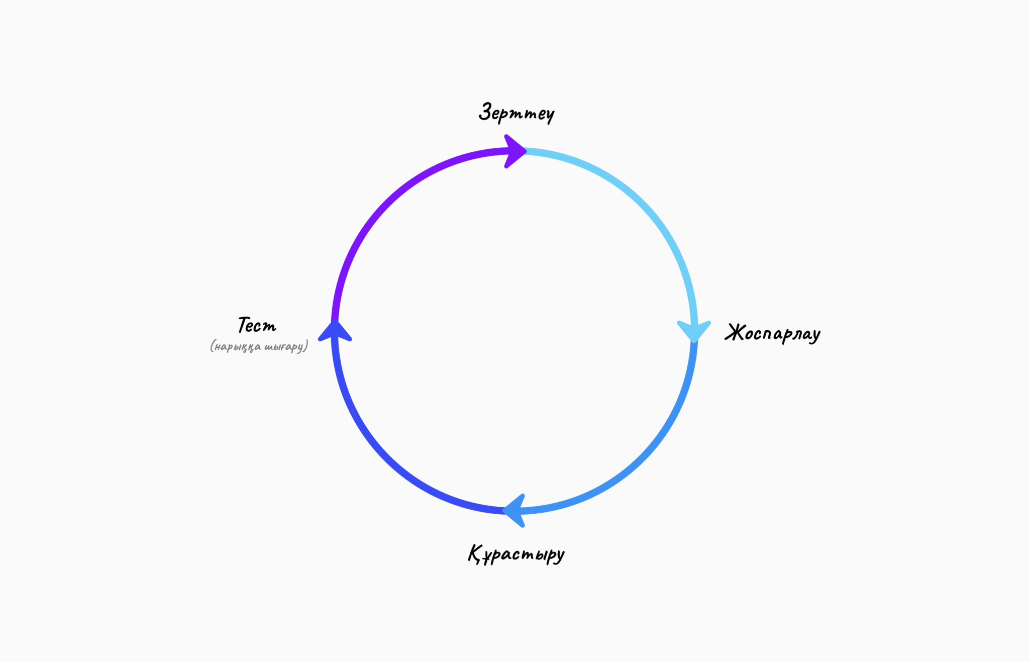 Оны 2ші суреттегі иллюстрация арқылы түсунеге болады. Сол суретке қарасақ, бір циклдің ішінде бірнеше этап бар екен: зерттеу, жоспарлау, құрастыру және фидбек жинау.